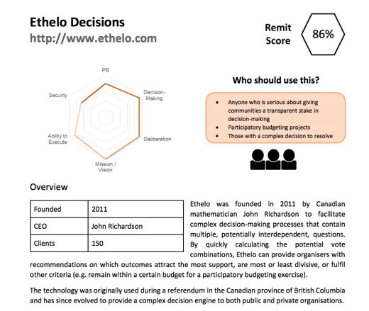 “Ethelo boasts strong unique selling points, including its ability to transparently display possible outcome scenarios for very complex decisions with multiple factors, as well as the ability to re-weight scenarios using demographic criteria such as age, gender, etc. of participants.”