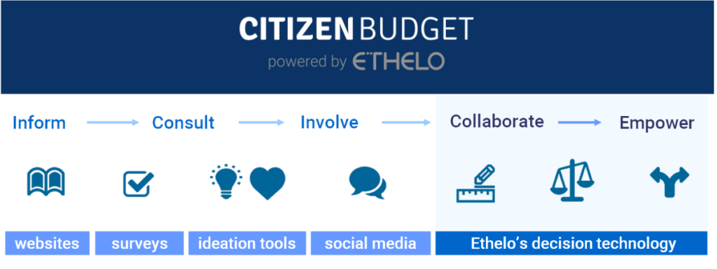 Used by over 100 local governments, Citizen Budget is Canada’s leading municipal budget engagement tool due to its real-time results, its user-friendly interface, and its overall ease of use. In early 2019, Citizen Budget joined forces with Ethelo Decisions, and the two systems recently became fully integrated into a single platform. The newly upgraded Citizen Budget, powered by Ethelo’s unique collective decision algorithms, can not only be used as a stand-alone tool, but can also be integrated into your municipal website or Bang the Table portal.