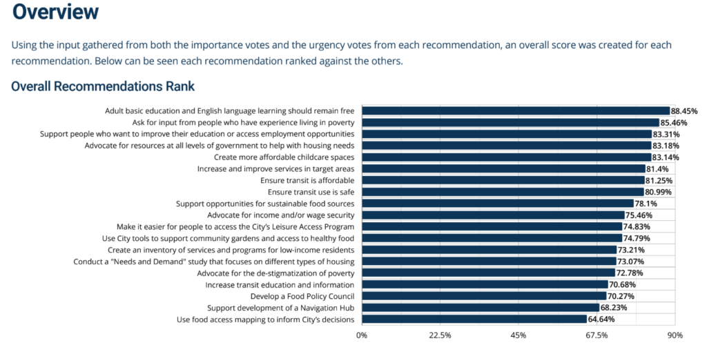 After bringing together diverse stakeholders and perspectives from throughout the community, the committee produced 19 recommendations for reducing poverty in Prince George. The committee then needed to engage the broader community to create awareness of the initiatives and learn which ones were the most urgent and highest priorities for residents.