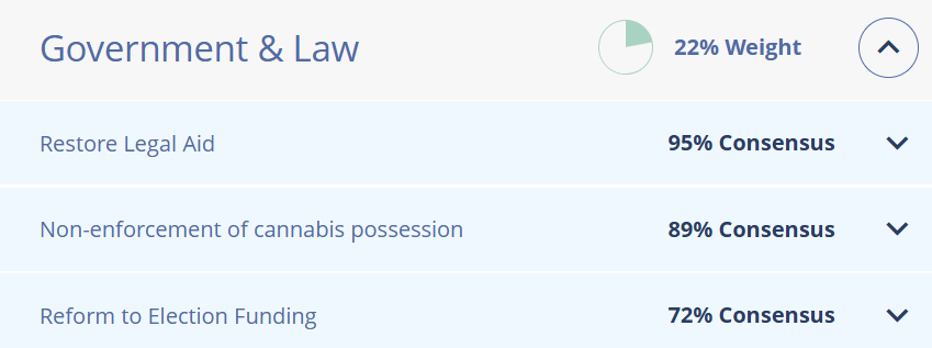 Some of the policy planks were not consistent with each other, for example “Oppose Pipelines” and “Oil Industry Expansion”. Ethelo was configured to ignore possibilities which contained contradictions. Nevertheless, most policies were compatible, and even after inconsistencies were removed, there were more than 220,000 possible policy platforms.