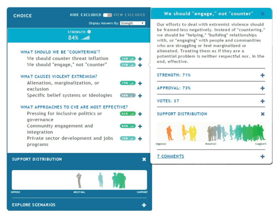 Ethelo focused the collective intelligence of the participants towards evaluating more than 15,000 highly nuanced alternative approaches to countering violent extremism. Ethelo was able to reveal levels of disagreement and consensus on different ideas, as well as areas of disagreement and consensus between different participant subgroups. For example, strong differences in opinion were exposed around the role of mental illness in extremism, and about the value of roles played by the private sector.
