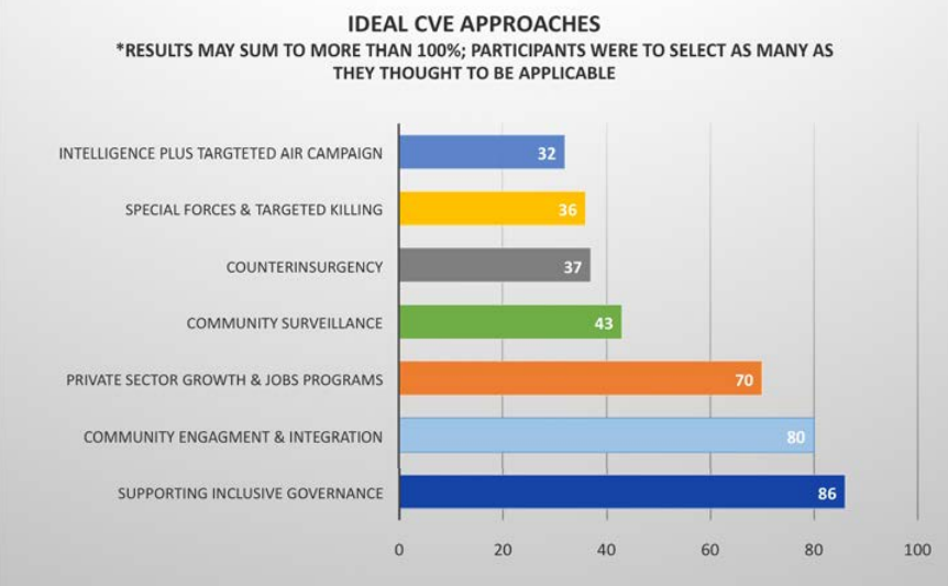 The results were delivered on the final day. Participants evaluated 17 distinct perspectives and approaches in answering three fundamental questions surrounding violent extremism:
